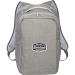 The Zoom® Grid 15" TSA Computer Backpack works to provide you the accessories you need for the technology you use every day. Sleek heathered gray material with gray/silver accents. Signature Zoom lining and cord pass through. Main compartment features a tablet sleeve and a mesh organizer pocket. Padded rear TSA laptop compartment for laptops up to 15.6 inches. Padded back and shoulder straps with trolley sleeve. Zoom branding and accents.