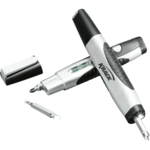 This 3-in-1 tool makes a great leave-behind when calling on plant managers or manufacturing reps. It features a built-in level and pen light and also works as a screwdriver. Includes 4 screwdriver bits (2 flathead and 2 Phillips head) conveniently stored underneath a removable cap. Pocket clip for attaching to a pocket or belt. 3 button cell batteries included.