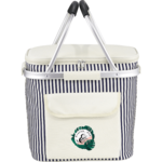 Part of the In Print Trend Collection, put a nautical spin on the picnic basket; this fresh cooler is perfect for outdoor events or toting your perfect dish and features an on-trend preppy striped print. Zippered main compartment. Open front pocket with hook and loop flap closure. Double aluminum handles with EVA padding for extra carrying comfort. Cooler can also detach from aluminum framing. 7.5" handle drop height. Insulated PEVA lining.