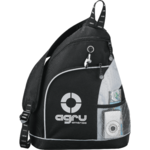 The Twister Sling Backpack features a zippered main compartment with an interior media pocket, an earbud port and a zippered front pocket and a mesh water bottle pocket. Contrast handle and adjustable strap.