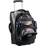 Three bags in one. Use it as a wheeled bag, backpack or daypack. Large main compartment with “book” style opening and interior clothing straps. Removable front daypack with zippered accessory pocket, dual side water bottle pockets and smart phone/MP3 player pocket with headphone port. Back strap slips over the extended handle of main bag. Meets FAA carry-on regulations.