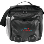 The Speaker Event Cooler is perfect for your next concert, sporting event or beach trip. It features a zippered leak-proof main compartment holds up to 12 cans. Features two speakers that are compatible with most iPhone®, iPod®, iPad®, smartphones, tablets and mp3 players. Zippered front pocket sized to hold most tablets and smart phones; Slash pocket inside holds battery box that uses three AA batteries (not included). One side mesh pocket. Adjustable shoulder strap. Insulated PEVA lining. Never lose your cooler with the ID label window.