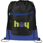 The Libra Front Zipper Drawstring Bag has an open main compartment with cinching rope closure. It also features a zippered front pocket and reinforced bottom corner tabs.