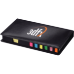 The Deluxe Memo Pad Desk Organizer includes two 80-page 3" x 3" sticky memo pads, sticky flags in six colors, 2-sided 4-year calendar, rubber bands, paper clips and a slot for a pen. There is also a 3-1/16" x 5-5/8" calendar is attached to the cover.