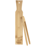 Made of natural bamboo this cutting board is perfect for cutting and serving bread or charcuterie. It also comes with bamboo tongs for easy serving. Due to the nature of the bamboo material, variations in laser imprinting quality may occur.