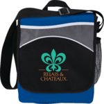 The Oasis Messenger Bag features a main compartment with a hook and loop flap closure and an open front pocket. Under the flap you'll find a pen sleeves pocket, a zippered mesh pocket and a side mesh pocket. The adjustable shoulder strap and a top carry handle make it comfortable to carry.