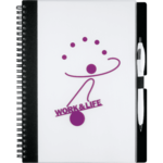 70 sheets of spiral bound white lined paper. Elastic pen loop. Important contacts page and calendar. Pen is not included.