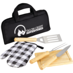 Five-piece BBQ set includes spatula with built-in bottle opener, fork, and knife (all with wooden handles), matching wooden cutting board, and a black and white plaid grilling mitt. All neatly stored in a zippered carrying case.