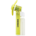 The Fiji Water Pocket Fan comes with a small water container and spray for extra relief from the heat. Water bottle on back of fan is detachable for easy fill-up! Two AA batteries are included.