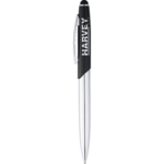 Sophisticated silhouette features matte upper barrel with shiny chrome lower barrel and accents. Premium black ballpoint ink cartridge. Rubberized stylus tip is ideal for touch screens, including iPhones and iPads, as well as retail payment pads.