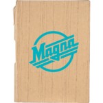 The 6" x 8.5" Bari Notebook is an A5 bound notebook designed to look like wood. It includes 80 sheets of beige ruled paper and a matching plastic ballpoint pen in the spine.