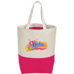 This cotton tote offers the natural feel of cotton with a added fun pop of color! 10 oz. cotton body is accented with a color pop panel which runs along the bottom of the bag. The color pop continues in the open main compartment which has a matching PVC lining. This lining is easy to clean and perfect for wet clothing or towels. This tote features a bottom board and 7" carry handles.